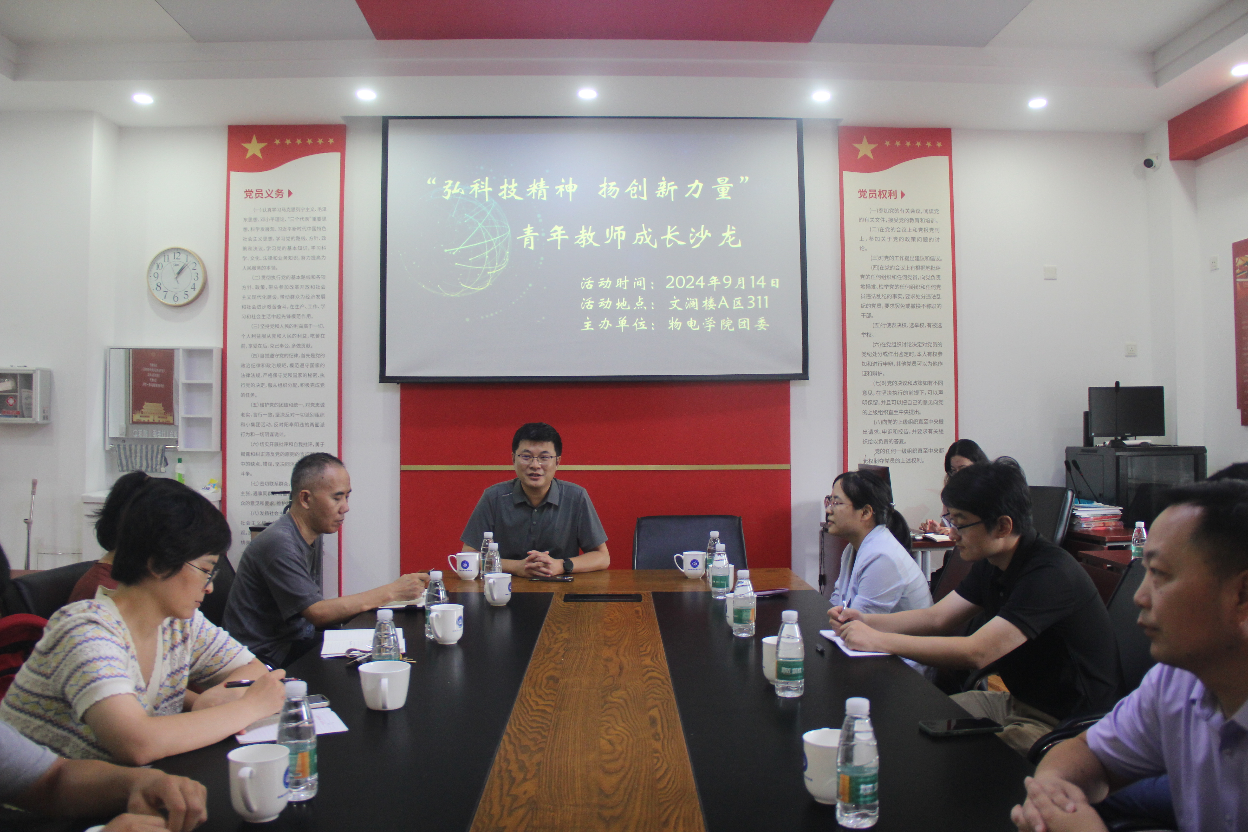 9月14日中午十二点,物理与电子科学学院于文澜楼A区F311举办“弘科技精神,扬创新力量”青年教师成长沙龙。本次活动学院党委书记谢德仁,党委副书记杜伟,团委书记、学工办主任方芳出席,青年教师代表、辅导员尹素月参加。首先,杜伟概述了物电学院在科创方面获得的成果以及在推进科研工作的过程中面临的挑战。接着,各青年教师就申报科研项目所遇到的问题进行了积极地交流,分享各自的工作经验。杜伟指出,在科研项目中教师的指导工作至关重要,...
