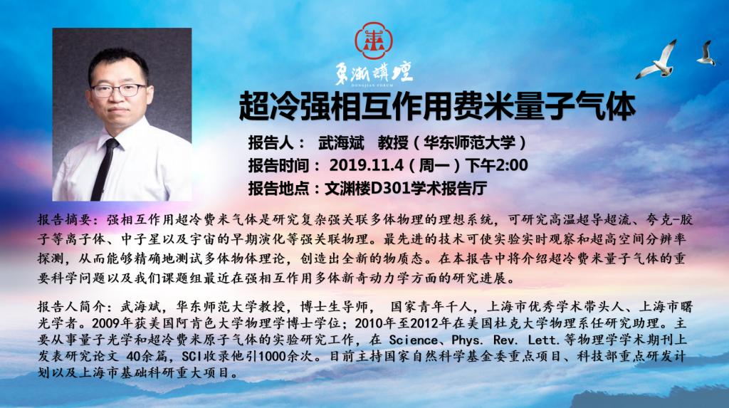 “东渐讲坛”第二十讲:超冷强相互作用费米量子气体 武海斌教授(华东师范大学)