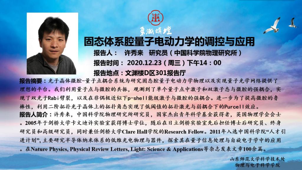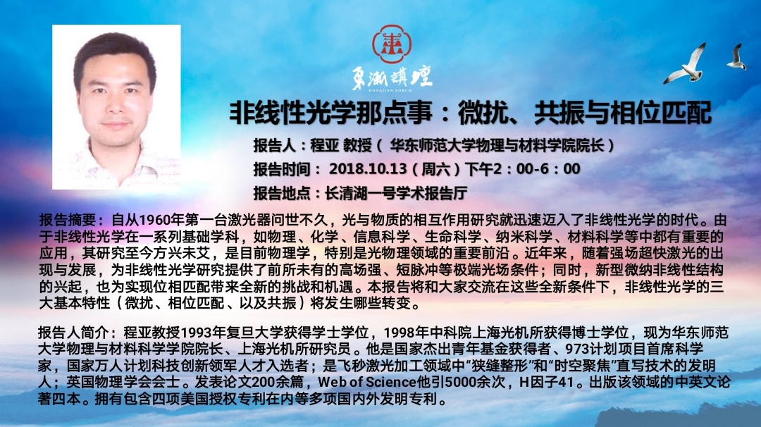 “东渐讲坛”是山东师范大学物理与电子科学学院在“双一流”建设进程中着力打造的高端科学论坛,取名“东渐讲坛”原因如下。一、讲坛名字出处源于《尚书·禹贡》中的“东渐于海”与近代“西学东渐”进程。“东渐于海”中的“东渐”原指河水东流入海,后引申为科学技术向东方流传。近代“西学东渐”进程中的“东渐”意味着西方科学技术向中国传播的过程。在中国近代史上,自19世纪60年代开始西方科技文化(包括物理学)大规模的...